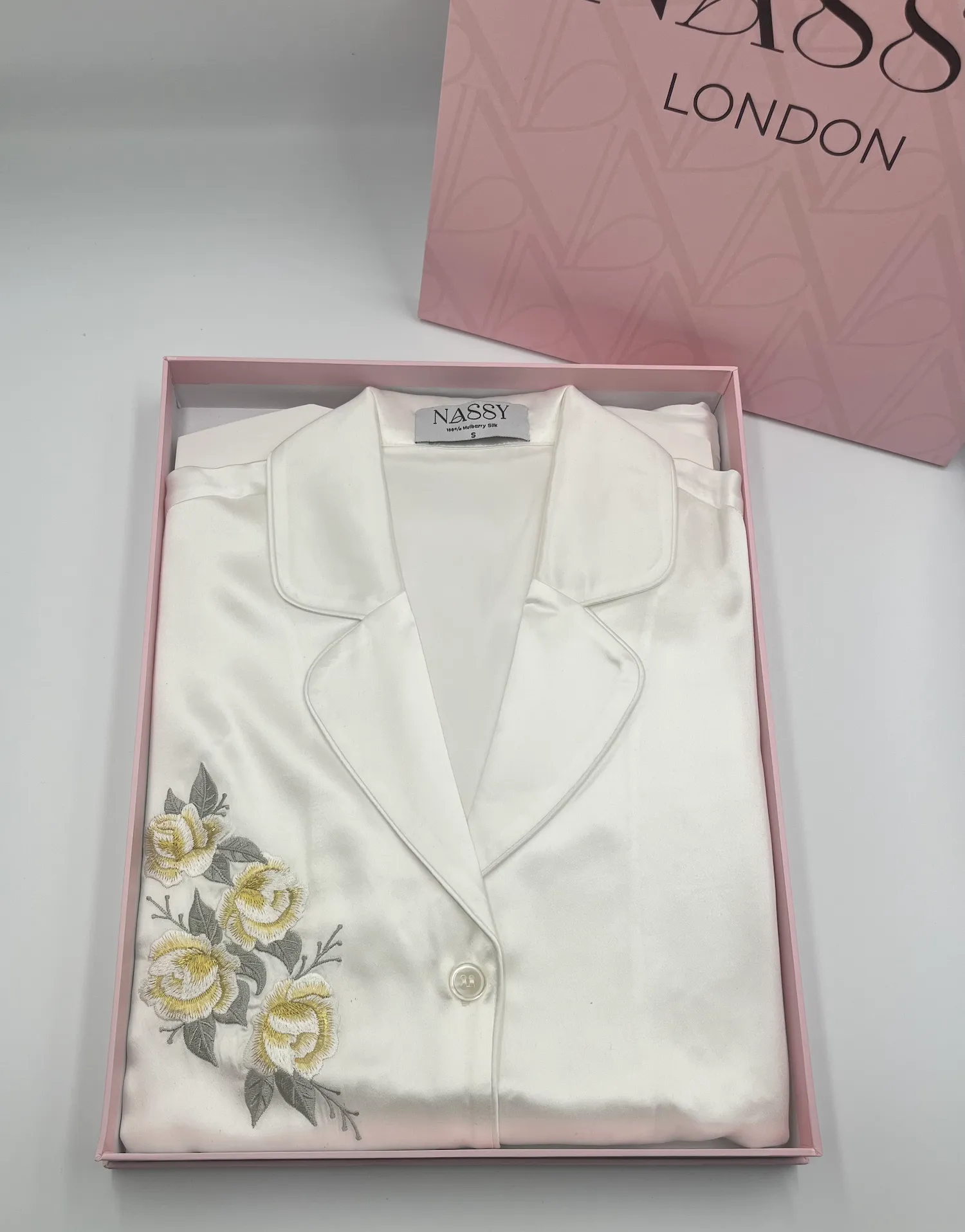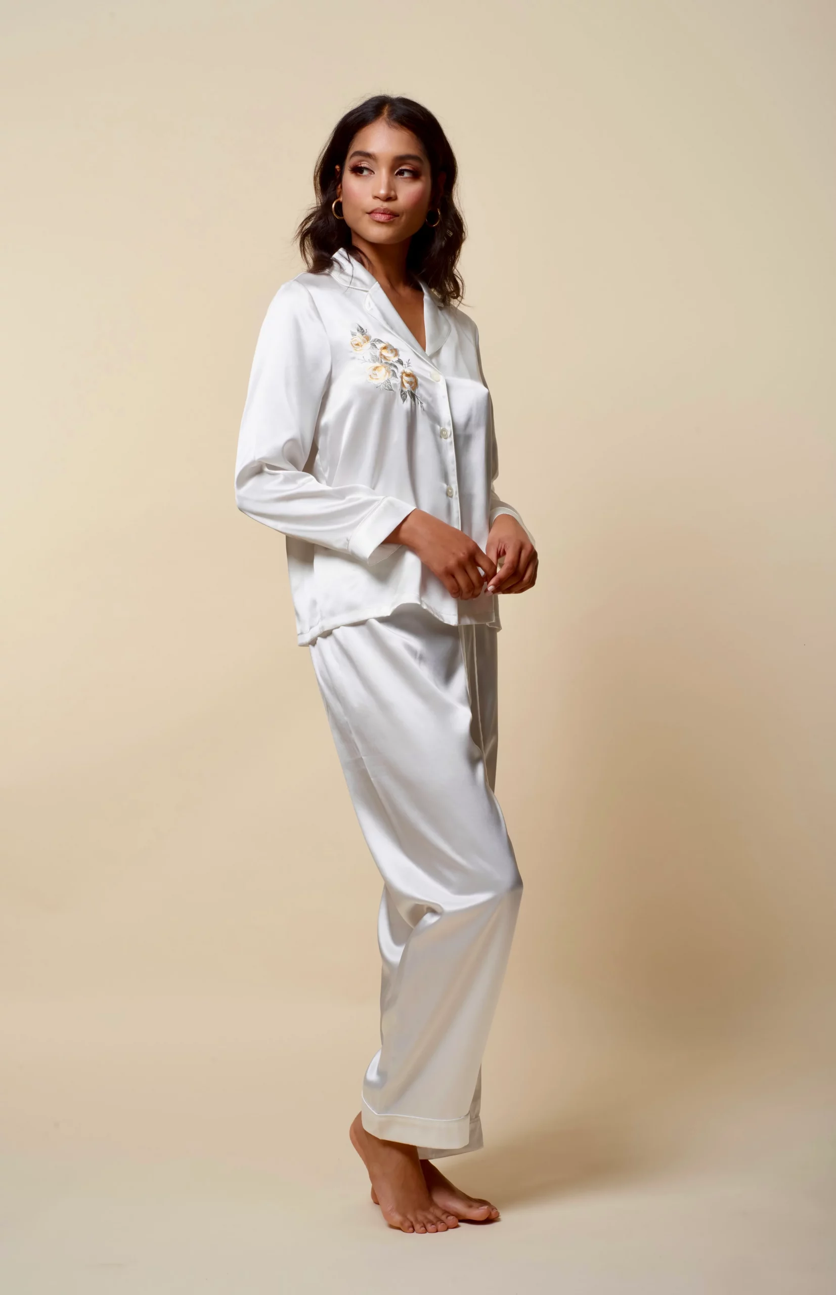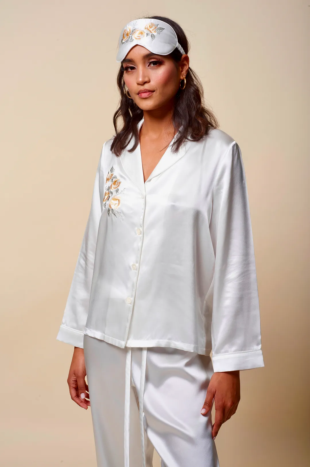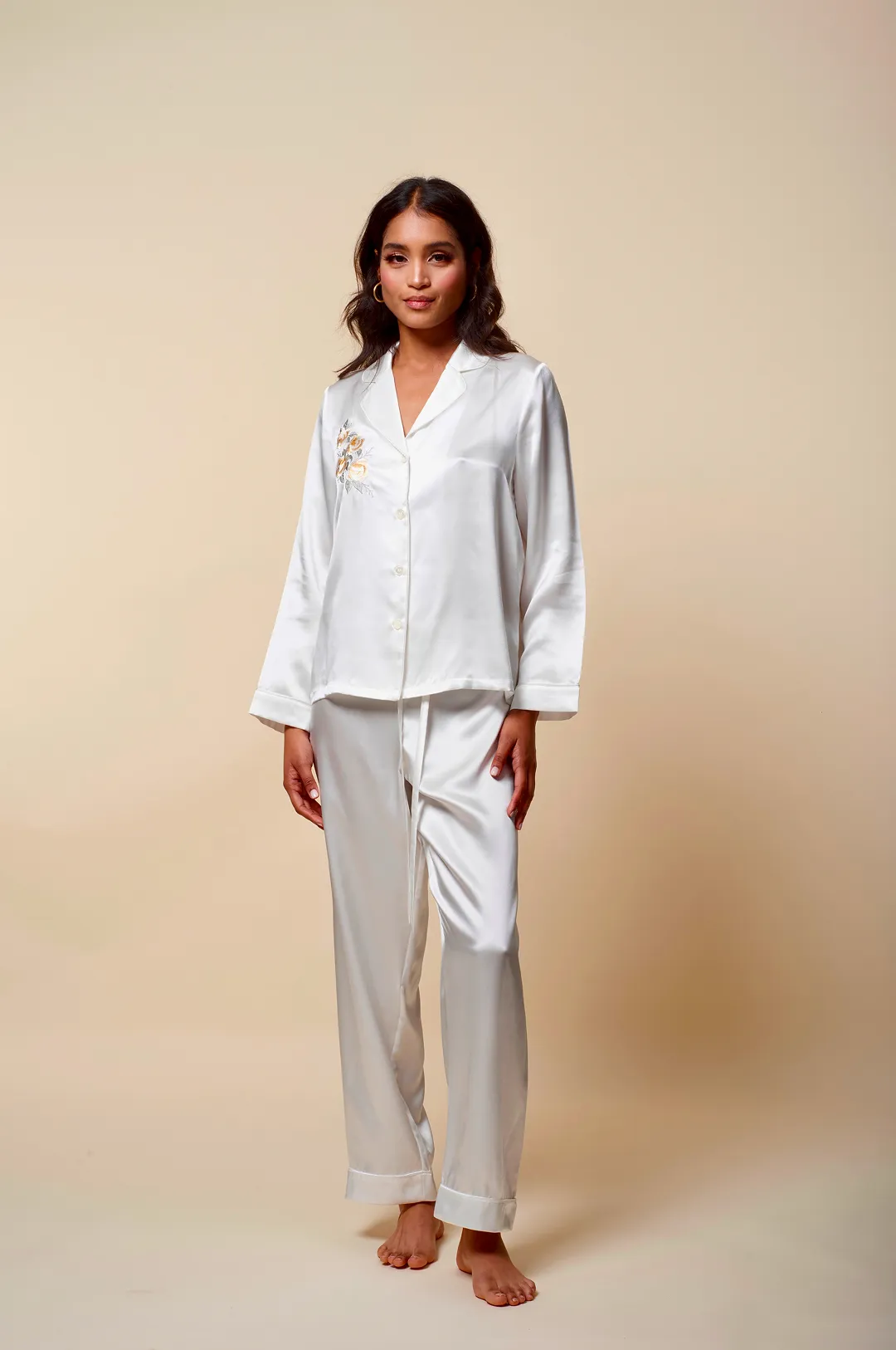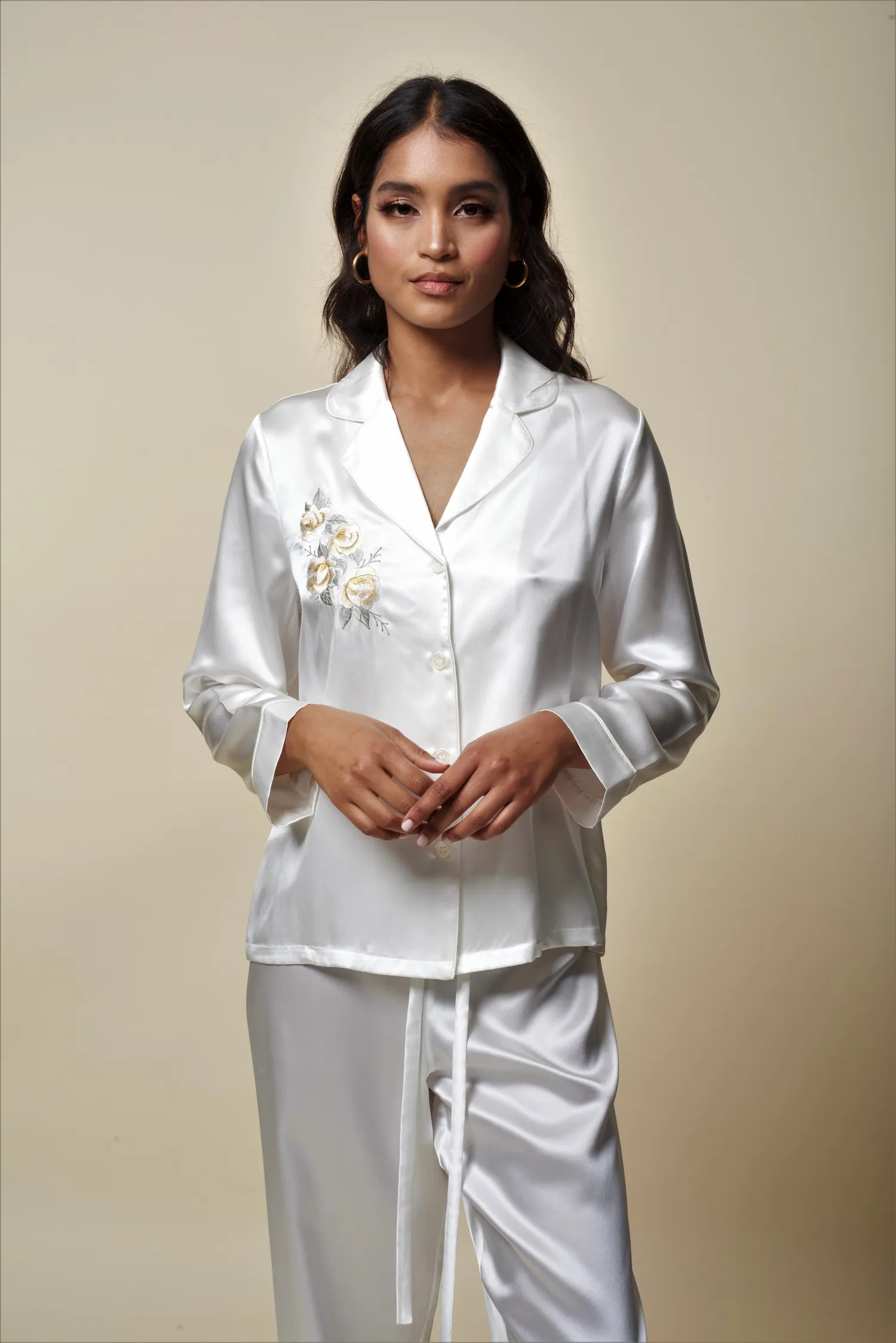Lila Camellia may be dressed in white, but she’s far from plain. Cut from our fluid 19 momme mulberry silk, she channels purity with intention — her crisp ivory shade offset by tonal piping and a single camellia bloom placed just-so at the chest. Her silhouette is timeless: a notch-collared shirt with pearlescent buttons and straight-leg trousers that move like water.